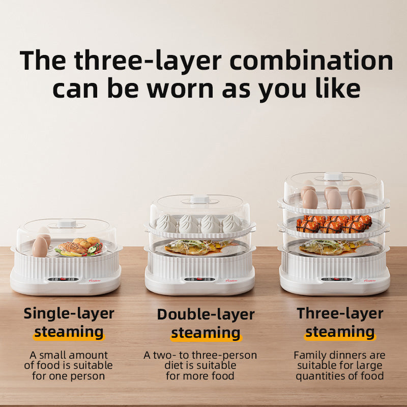 - 3-Layer Large Capacity – Perfect for Cooking Multiple Foods: This electric steamer features three stackable layers with a 10L capacity, ideal for steaming vegetables, seafood, meat, dumplings, and rice.
