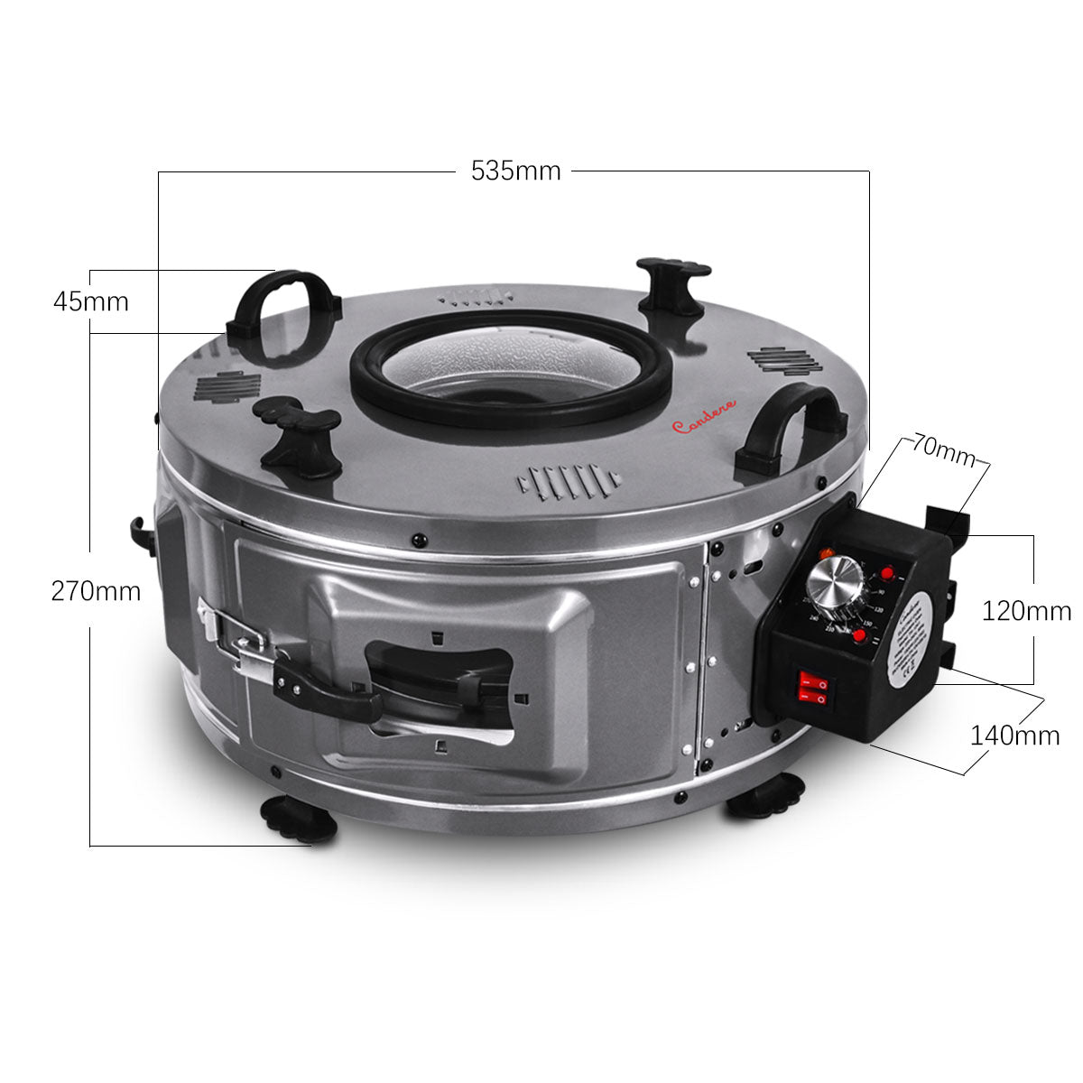 - Compact Design with Integrated Cable Storage: With dimensions of 60.7x53.5x31.5 cm, the CONDERE Electric Oven is compact yet spacious. Integrated cable storage and a reliable locking system add practicality, making it ideal for turkey roaster electric and electric roaster oven applications.