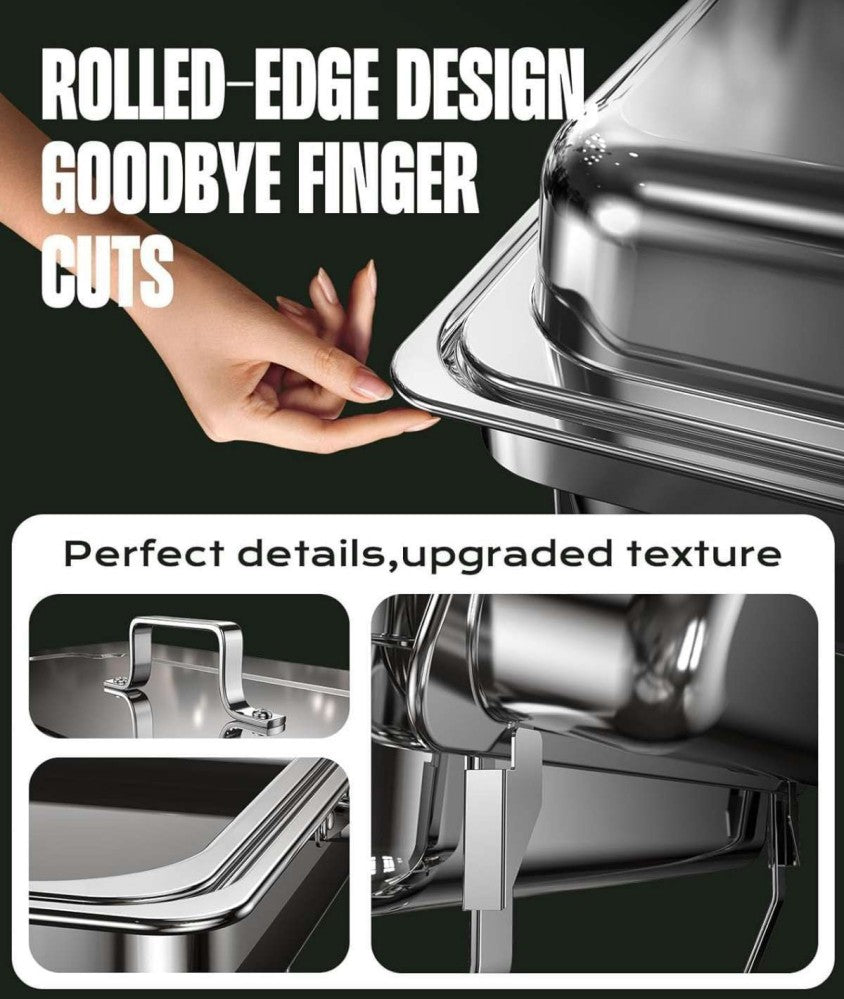 The LP-D Two-pans Alcohol-heating Buffet Stove is a professional 9L chafing dish designed for multi-dish serving in restaurants, hotels, catering businesses, and buffet setups. This square stainless steel set in silver color offers exceptional durability, corrosion resistance, and a sleek, elegant appearance suitable for various dining environments. With two stainless steel food pans, the LP-D allows you to heat and serve two different dishes simultaneously. Its large 9L capacity ensures it can hold generous portions, making it perfect for busy service hours or large gatherings. The bottom tray supports two fuel containers, delivering excellent heat preservation to keep food warm for long periods without electricity. The food pans are made of heat-resistant stainless steel, ensuring safety, longevity, and easy cleaning. Designed for mobility and convenience, the chafing dish is equipped with a folding frame, allowing effortless transportation and compact storage—ideal for caterers and event organizers. Combining large capacity, double-pan functionality, superior heat retention, premium stainless steel construction, and portability, the LP-D alcohol-heating buffet stove is an excellent choice for anyone seeking a reliable heating and serving solution.